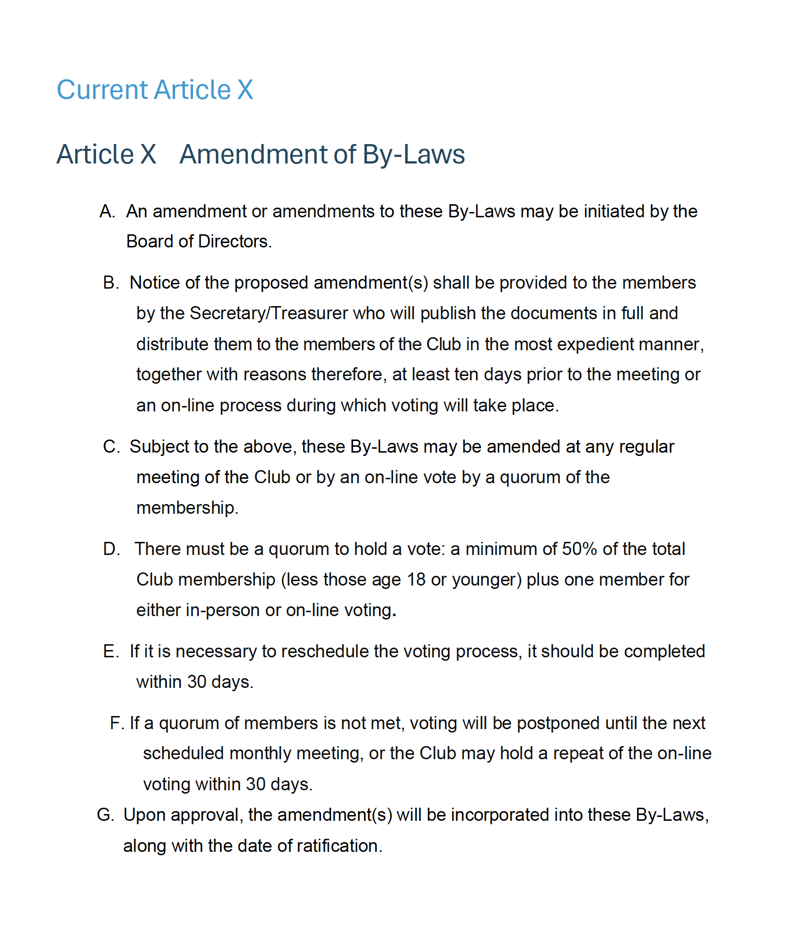 Currently Article X requires a quorum vote of the full membership to change anything in our By-Laws. Because we seldom have had a quorum of the full membership attend a monthly meeting and because it has been a bit difficult to get a quorum of the membership to respond to an online voting request, the Board has agreed to the Proposed Amendments to Article X.